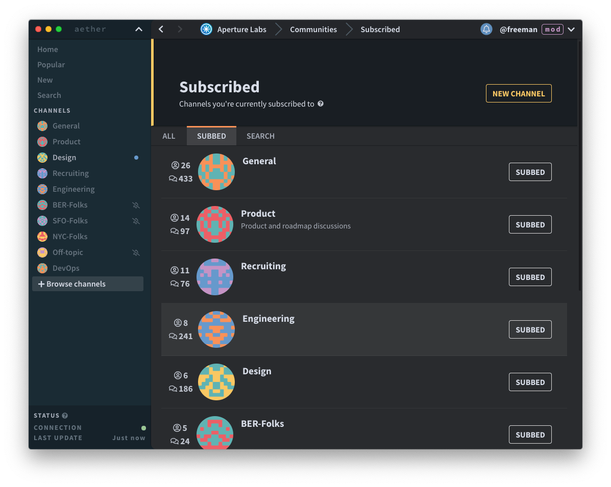 An Aether universe is the single place where your online community gathers. Each universe can have as many subs as needed, which can be created and joined by members of the community. Each sub has its own chat room, forum threads, and email newsletters. For example, official communication can be sent through newsletters, rich discussions can be recorded in nested threads, and quick decisions can be synchronously hashed out in chat. This allows members to participate in a community according to their personal preferences.